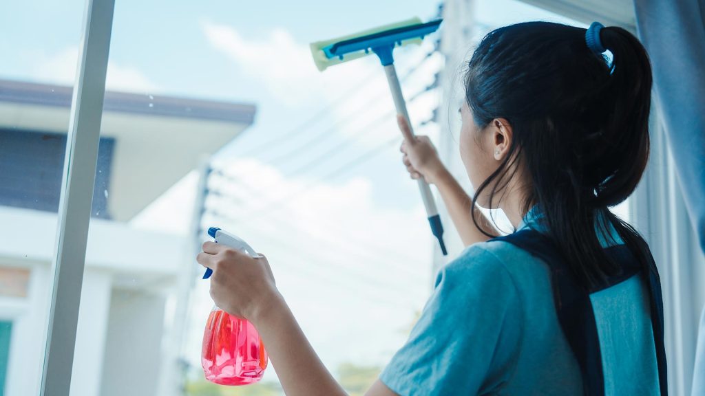 - Prep – Mix your cleaning solution and set up supplies near the window.